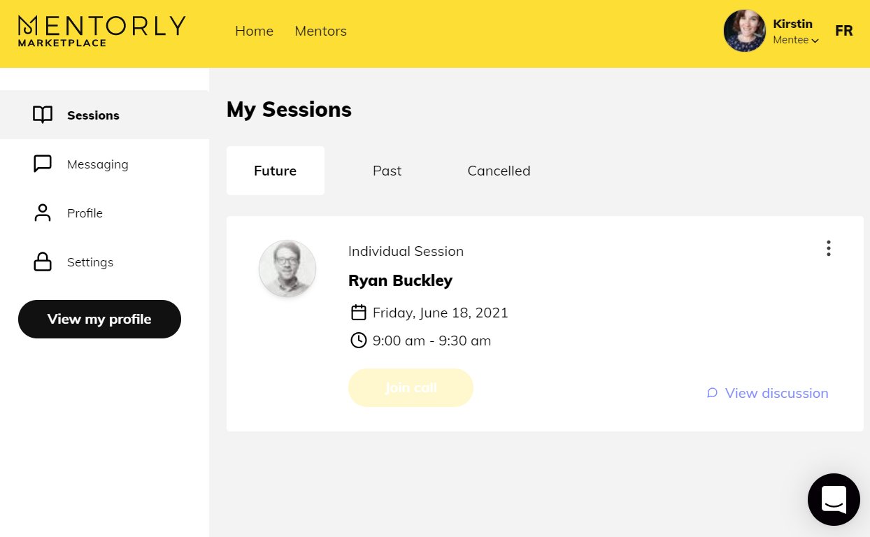 Once your mentor has accepted your session request, you can see your future session under the Sessions tab of your Dashboard.
