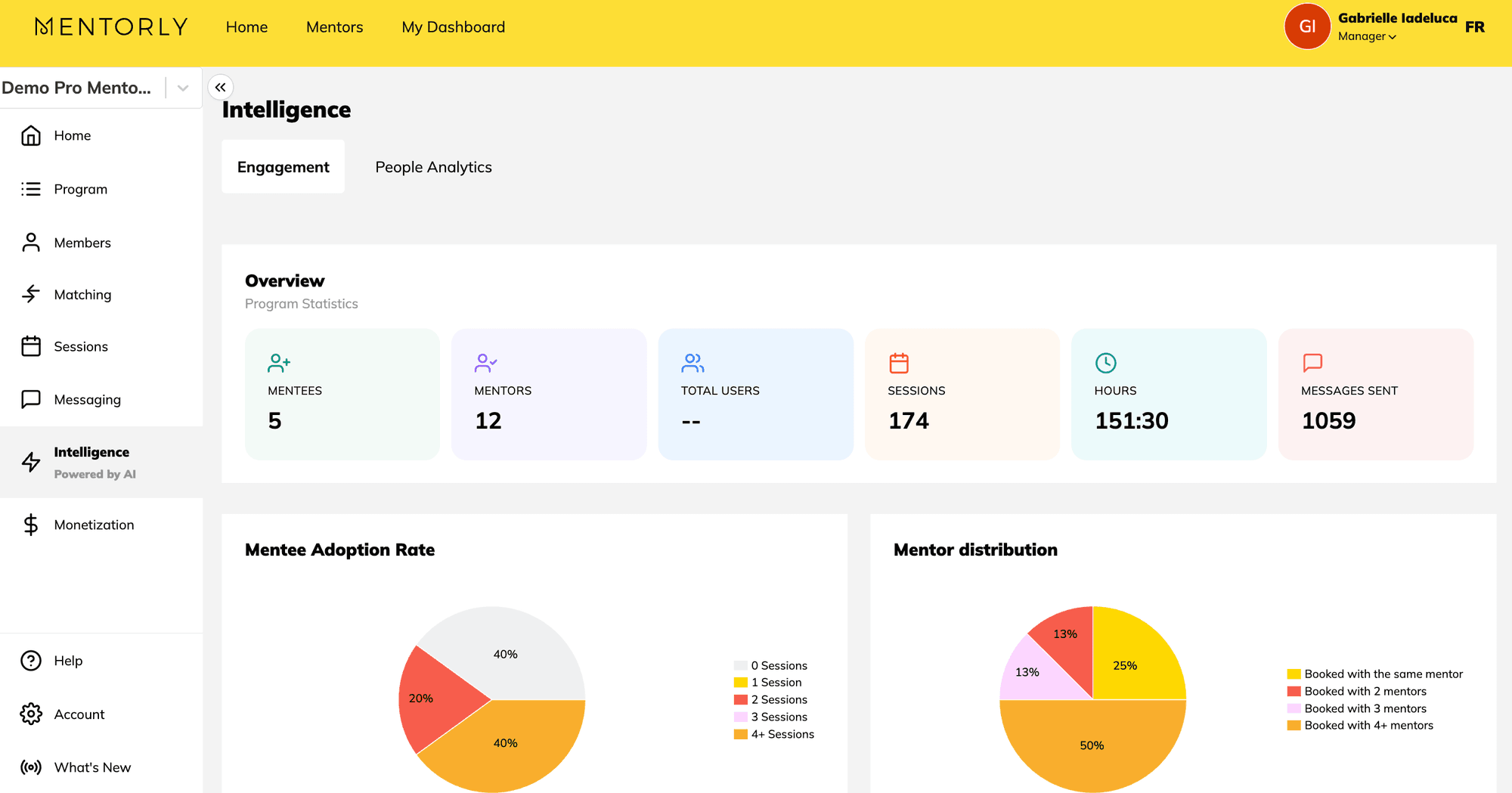 Mentorly Intelligence is an AI-powered reporting feature that gives you a clear picture of how your mentorship program is performing. With insights across engagement, participant sentiment, mentee goals, conversation themes, skill gaps, and growth opportunities, you can make data-informed decisions to strengthen your program and support every participant’s journey.
