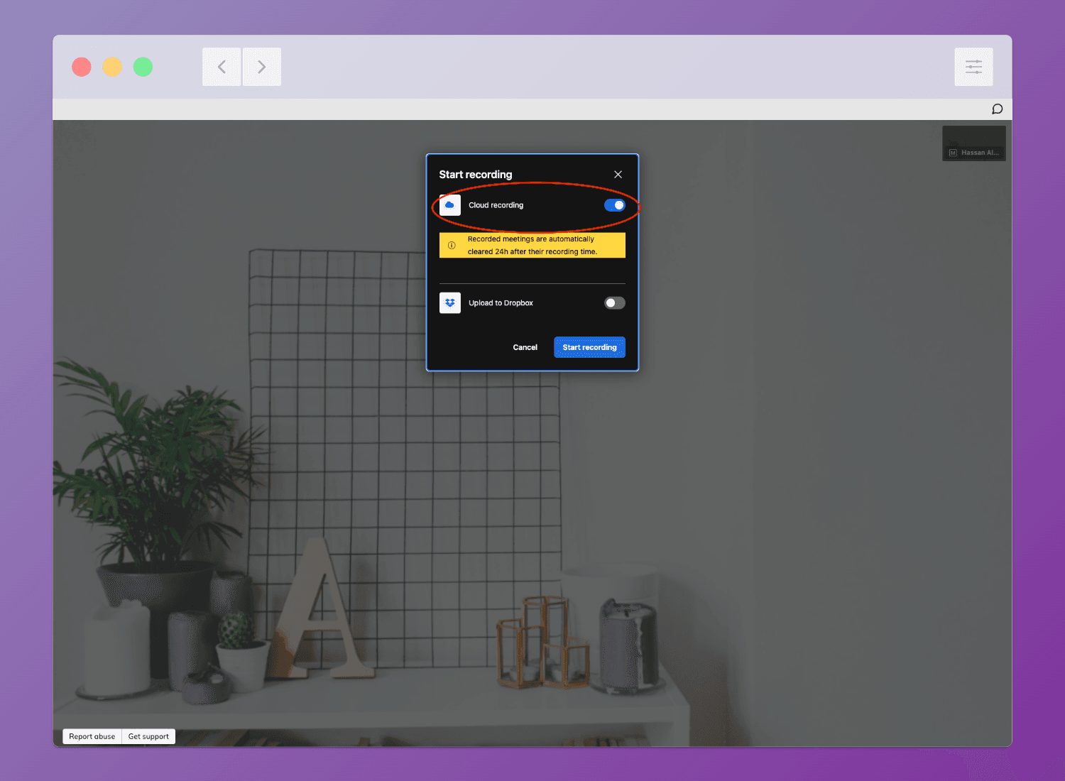 2. During your call, and by clicking on the sub-menu, you'll see a button labeled "Start Recording." Click on this button and toggle the "Upload to Dropbox" option.