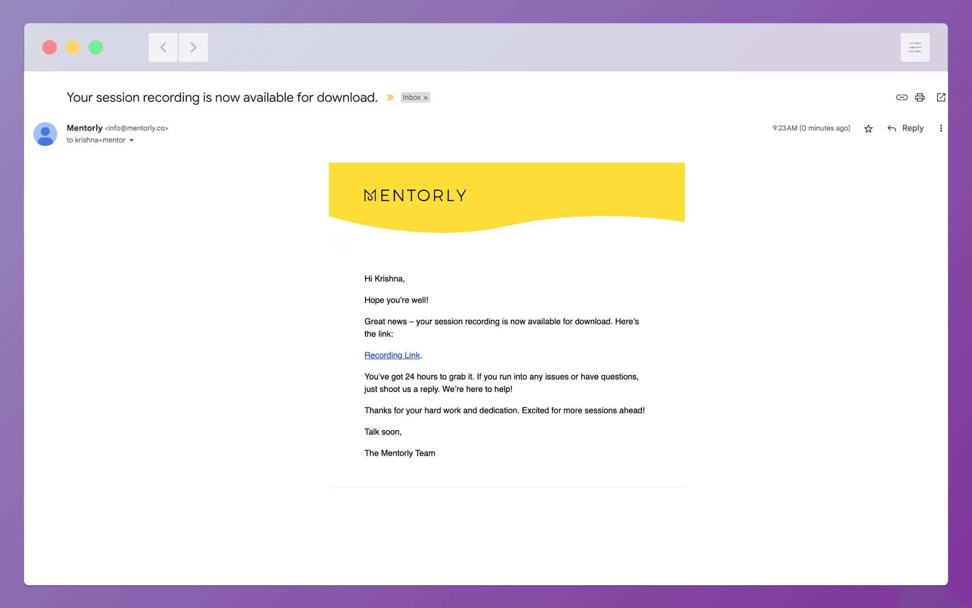 5. Shortly after ending the call, you will receive an email with a link to download the recording. This email will serve as your secure access point to the recorded session, allowing you to revisit the valuable insights and advice shared during your Mentorly experience.