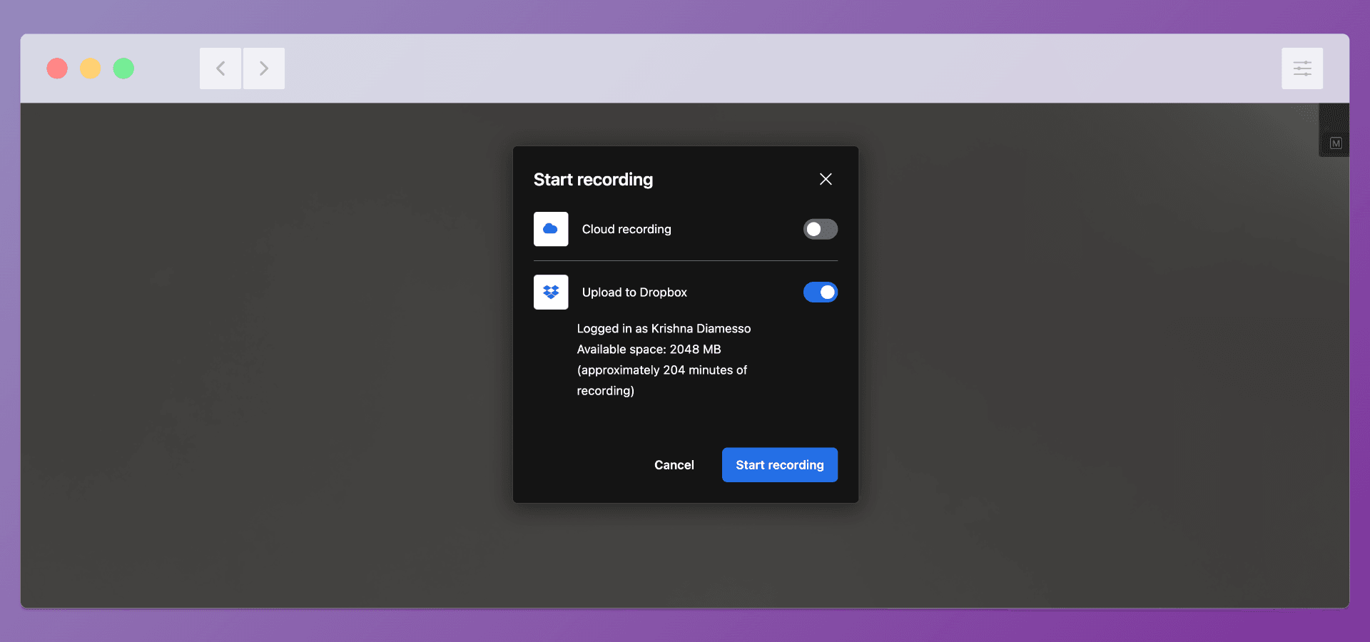 3. Log in to your Dropbox account and authenticate your account. Once it's done, click "Start Recording"