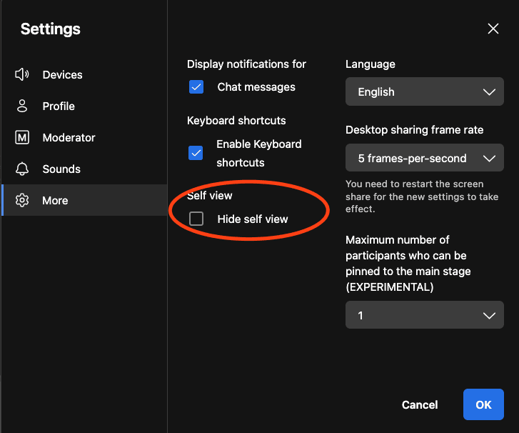 Remember, if you want to see yourself, make sure the "Hide Self-view" option is turned off.