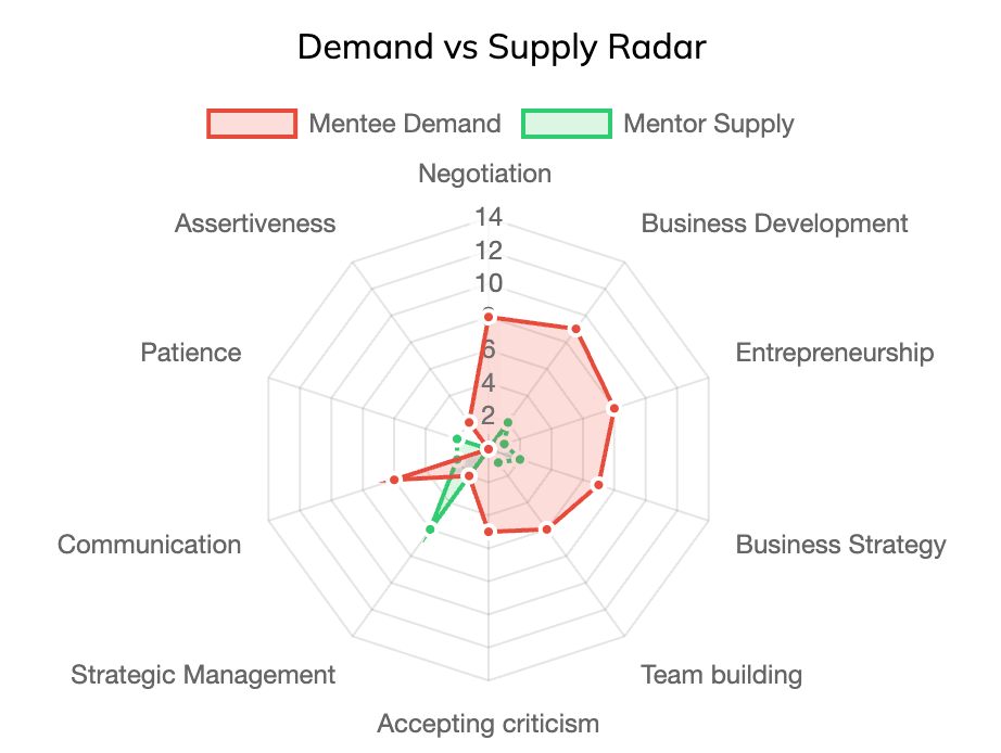 This analysis highlights where mentee needs and mentor skills aren’t fully lining up, making it so you can take proactive steps to close the gap. The first thing you’ll see are three easy-to-read graphs: